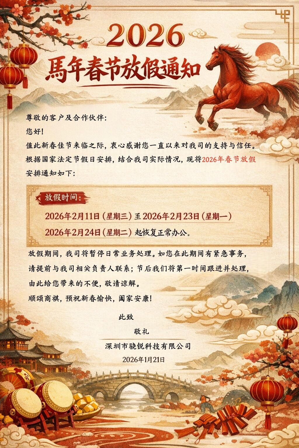 深圳市驍銳科技有限公司2026年春節(jié)放假通知